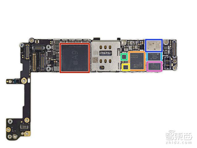 最后要展示的便是蘋果iPhone 6s的核心主板區域,幾乎所有重要的芯片均位于其中。 上圖及下圖為正面部分。 ①紅色部分:蘋果全新的A9處理器及三星LPDD
