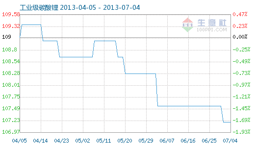 7月4日工業(yè)級碳酸鋰商品指數(shù)為107.19,與昨日持平,較周期內(nèi)最高點112.10點(2012-11-04)下降了4.38%,較2012年01月05日最低點98.94點上漲了8.34%。(注:周期指2011-09-01至今) 工業(yè)級碳酸鋰商品指數(shù)