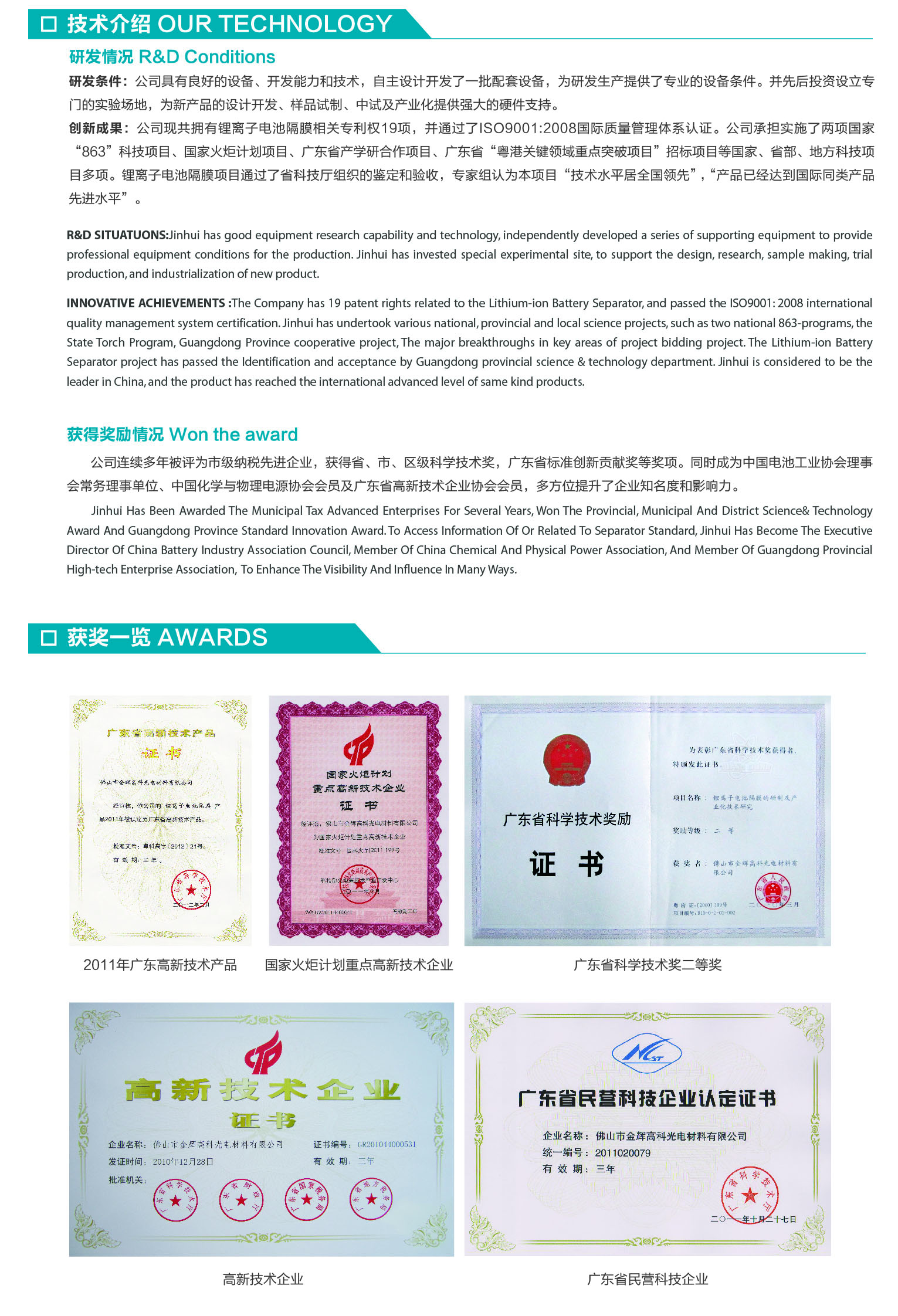 佛山市金輝高科光電材料有限公司(簡(jiǎn)稱金輝公司)成立于2006年,目前注冊(cè)資本為921萬(wàn)美元,是國(guó)內(nèi)第一家使用濕法工藝生產(chǎn)鋰離子電池隔膜的廠家,國(guó)家火炬計(jì)劃重點(diǎn)高新技術(shù)企業(yè),廣東省創(chuàng)新型企業(yè)試點(diǎn)單位。我司研制生產(chǎn)的鋰離子電池隔膜以質(zhì)量穩(wěn)定、性價(jià)比高等優(yōu)勢(shì)蜚聲國(guó)內(nèi)外市場(chǎng),打破了長(zhǎng)久以來(lái)國(guó)外產(chǎn)品的壟斷,填補(bǔ)了國(guó)內(nèi)空白,工藝技術(shù)居國(guó)內(nèi)領(lǐng)先地位,產(chǎn)品質(zhì)量達(dá)到國(guó)際同類產(chǎn)品先進(jìn)水平。