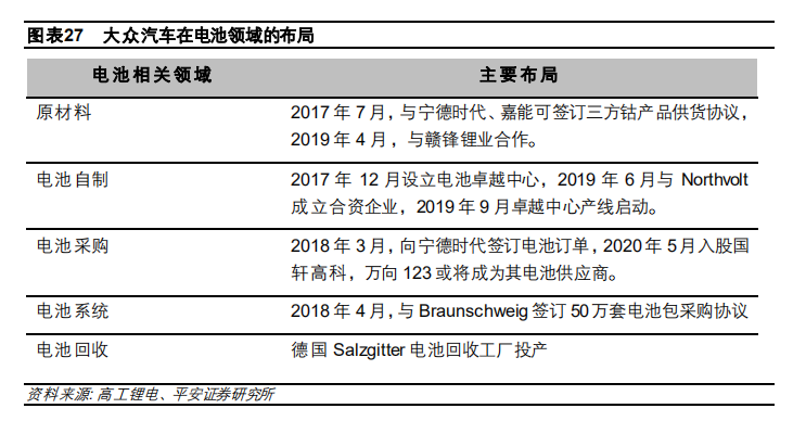 為了保障集團(tuán)未來電動(dòng)車的生產(chǎn)和銷售,大眾也加大了全球范圍內(nèi)動(dòng)力電池的布局。一方面先后與 松下、三星 SDI、LG 化學(xué)、SKI、寧德時(shí)代等傳統(tǒng)主流電池供應(yīng)商發(fā)展戰(zhàn)略合作伙伴關(guān)系;另一方面,通過資本投資、合資建廠等方式介入電池的生產(chǎn)和管理,掌握核心技術(shù)、保障供應(yīng)鏈安全。此 次入股國(guó)軒高科是大眾在中國(guó)推進(jìn)電動(dòng)化戰(zhàn)略的關(guān)鍵一步,通過資本介入的方式加大對(duì)供應(yīng)鏈的把 控,有利于減輕對(duì)第三方供應(yīng)商的依賴、保障供應(yīng)鏈的穩(wěn)定。