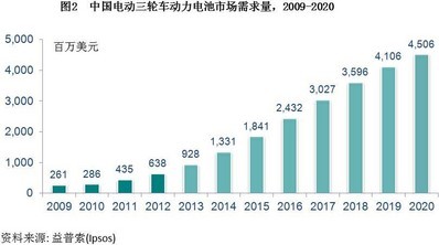 報(bào)告顯示,隨著農(nóng)村地區(qū)消費(fèi)實(shí)力的進(jìn)一步釋放,益普索預(yù)測(cè)到2020年,對(duì)電動(dòng)自行車(chē)的需求將達(dá)到3157萬(wàn)輛,2013年至2020年期間年復(fù)合年增長(zhǎng)率為4%,而電動(dòng)自行車(chē)動(dòng)力電池的銷(xiāo)售額預(yù)計(jì)在此期間實(shí)現(xiàn)6%的年復(fù)合增長(zhǎng)率,一級(jí)市場(chǎng)和二級(jí)市場(chǎng)的銷(xiāo)售額預(yù)計(jì)達(dá)到67億美元。據(jù)分析,受農(nóng)村市場(chǎng)中老年人的追捧,電動(dòng)三輪車(chē)制造商近年來(lái)已實(shí)現(xiàn)快速增長(zhǎng),2012年銷(xiāo)售量近600萬(wàn)輛,同比增長(zhǎng)60%;到2020年,鑒于中國(guó)老齡化人口的不斷增多,銷(xiāo)售量有望進(jìn)一步攀升至2643萬(wàn)輛,而電動(dòng)三輪車(chē)動(dòng)力電池的銷(xiāo)售額預(yù)計(jì)在2013年至2020年間取得28%的復(fù)合年增長(zhǎng)率,達(dá)到45億美元。與此同時(shí),隨著中國(guó)大力倡導(dǎo)發(fā)展節(jié)能、環(huán)保產(chǎn)品的新形勢(shì)下,低速電動(dòng)四輪車(chē)將迎來(lái)大的發(fā)展機(jī)遇,益普索預(yù)測(cè)到2020年,中國(guó)低速電動(dòng)四輪車(chē)總需求有望達(dá)到82萬(wàn)輛,支持低速電動(dòng)四輪車(chē)有較強(qiáng)價(jià)格競(jìng)爭(zhēng)優(yōu)勢(shì)的鉛酸電池在未來(lái)也將獲得新的增長(zhǎng)。