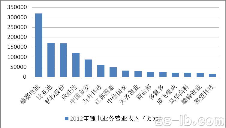 圖1 2012年上市公司鋰電業務營業收入前十五家