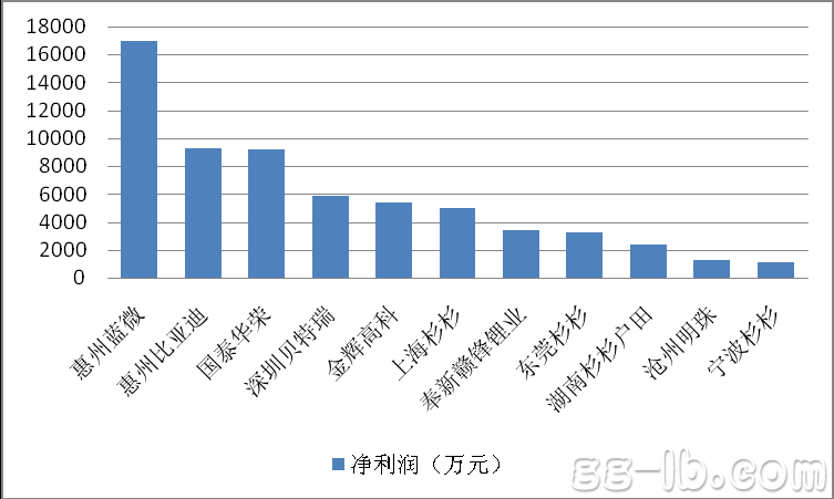 據初步統計,50家鋰電上市公司中主營為鋰電業務的子公司有104家,這當中,最賺錢的鋰電公司是德賽電池控股的惠州蘭微,凈利潤高達1.7億,而比亞迪控股的惠州比亞迪電池有限公司以及江蘇國泰控股的國泰華榮的凈利潤也在9000萬左右,緊隨其后的是中國寶安旗下的深圳貝特瑞,2012年的凈利潤是5901萬,另外佛塑科技旗下的金輝高科的凈利潤也在5000萬之上,其他公司的凈利潤都低于5000萬。(圖2)