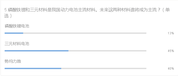 磷酸鐵鋰和三元材料是我國動力電池主流材料。工信部“暫停三元鋰電池客車列入新能源汽車推廣應用推薦車型目錄”的決定一時間讓三元材料陷入尷尬境地。然而,在乘用車領域,向來使用磷酸鐵鋰電池的比亞迪也開始看重三元電池在能量密度方面的優勢。而通過整理發現,多數被調研者認為未來三元材料將成為主流,在乘用車領域的安全性目前控制較好。另外則認為三元電池和磷酸鐵鋰電池未來市場占有率將勢均力敵。總體來說,三元電池未來發展態勢會更積極,作為解決方案更為有效。