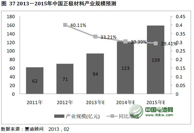 就中國產(chǎn)業(yè)而言,得益于動力鋰離子電池的快速發(fā)展,2013年正極材料產(chǎn)業(yè)整體產(chǎn)業(yè)規(guī)模將達到94億元,同比增長33.2%,并且未來三年市場規(guī)模增速均會保持在30%以上,到2015年整個中國正極材料產(chǎn)業(yè)的市場規(guī)模將達到159億元。