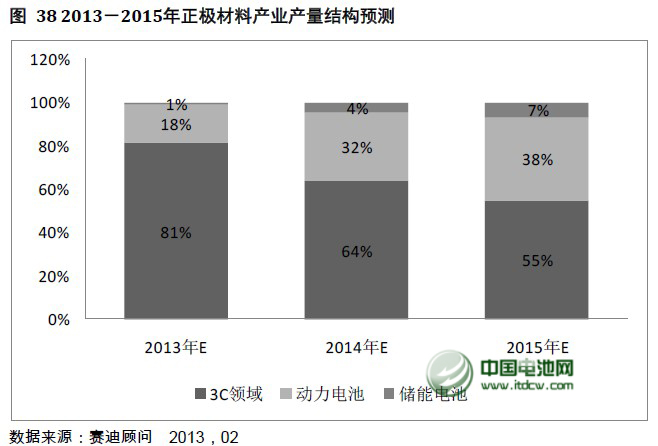 從鋰離子電池市場結(jié)構(gòu)來看,中國電池網(wǎng)戰(zhàn)略合作機構(gòu)——賽迪顧問認為,正極材料規(guī)模未來三年內(nèi)增長的動力來自于以新能源汽車電池為代表的動力電池。到2015年鋰離子動力電池市場規(guī)模占比將達到38%。