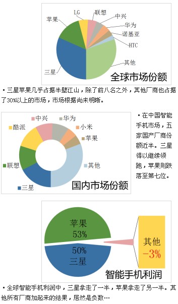 在手機(jī)硬件領(lǐng)域,三星和蘋果占據(jù)了半壁江山——這比手機(jī)平臺的局面要好很多。起碼,兩位領(lǐng)先者還給后來人留下了一半的市場空間。在全球手機(jī)市場,三星與蘋果分別占據(jù)31.7%和14.2%的市場空間,第3到8名一共占據(jù)了23.6%的份額——剩下的30%,有更多的長尾廠商瓜分。