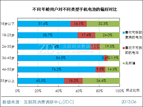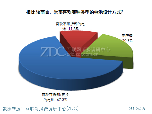 ZDC 調查數據顯示,參與調查的近千名中國IT網民中,七成用戶所使用的手機電池為可拆卸、可更換型,同時在偏好程度的選擇上,67.3%的IT網民表示喜歡可 拆卸、可更換電池的手機,有超一成的IT網民明確表示不喜歡不可拆卸/更換電池的手機。另有兩成網民對手機電池是否可拆卸/更換表示無所謂。
