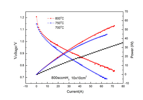 中科院寧波材料技術(shù)與工程研究所燃料電池與能源技術(shù)事業(yè)部生產(chǎn)的以LSCF為陰極的陽(yáng)極支撐電池性能最近取得了顯著提高。通過對(duì)電池生產(chǎn)工藝的優(yōu)化以及測(cè)試方式的改進(jìn),目前在800℃時(shí),0.8V下的單片電池放電電流可達(dá)到72A,單片電池功率超過57W,功率密度達(dá)到0.88W/cm2,燃料利用率Fu大于62%;在750℃時(shí),0.75V下的單片電池放電電流可達(dá)到70A,單片電池功率超過50W,功率密度達(dá)到0.8W/cm2,燃料利用率Fu大于50%,電池測(cè)試的有效面積為64cm2。對(duì)電池進(jìn)行了電化學(xué)阻抗測(cè)試,800℃測(cè)試阻抗值為2.300mΩ,750℃為3.453mΩ,數(shù)值均很小,接近理論計(jì)算值,說明電池各層的接觸非常好。