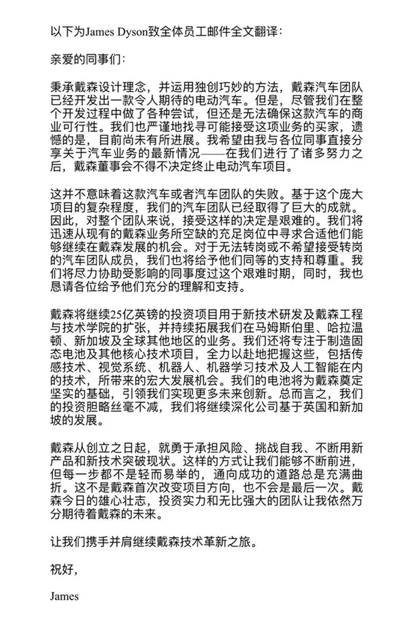 盡管我們?cè)谡麄€(gè)開(kāi)發(fā)過(guò)程中做了各種嘗試,但還是無(wú)法確保這款汽車的商業(yè)可行性。我們也嚴(yán)謹(jǐn)?shù)卣覍た赡芙邮苓@項(xiàng)業(yè)務(wù)的買家,遺憾的是,目前尚未有所進(jìn)展。在我們進(jìn)行了諸多努力之后,戴森董事會(huì)不得不決定終止電動(dòng)汽車項(xiàng)目?!?0月10日,戴森公司創(chuàng)始人詹姆斯·戴森在官網(wǎng)上發(fā)布了給全體員工的公開(kāi)信,表示終止籌備了六年之久的電動(dòng)汽車項(xiàng)目。