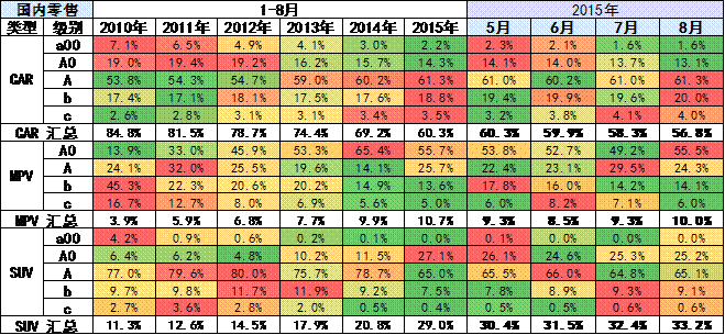 此表用體現的是每一個細分類別占上一層級總零售量的比重,與包含出口和庫存變化的批發增長有所差異。15年8月的市場體現SUV走強趨勢特征明顯,轎車市場的地位處于江河日下的狀態,轎車中的中高級別走勢較好,低端受到分流影響較大。多功能車市場超強增長,其中近年MPV是中低端需求也有下降,A0級MPV表現逐步走弱,逐步推移到A級MPV。但本月的B級以上MPV車型表現較好,中低端有所調整。