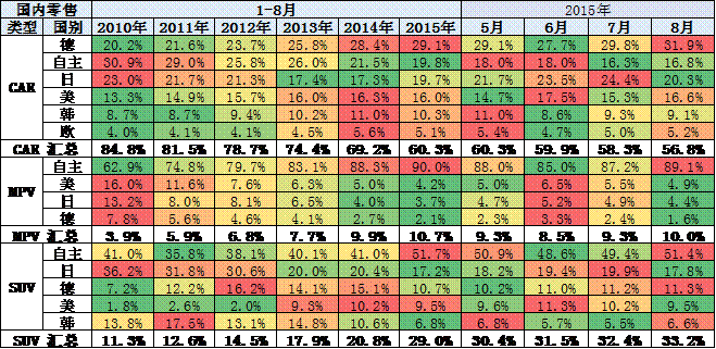 15年自主品牌在SUV市場獲得巨大的份額增長,從41%上升到52%,而德系的SUV從15%下降到10%,這也是巨大的反差。而自主品牌在轎車市場的份額從22%下降到20%。但8月的日系和美系轎車表現較好。