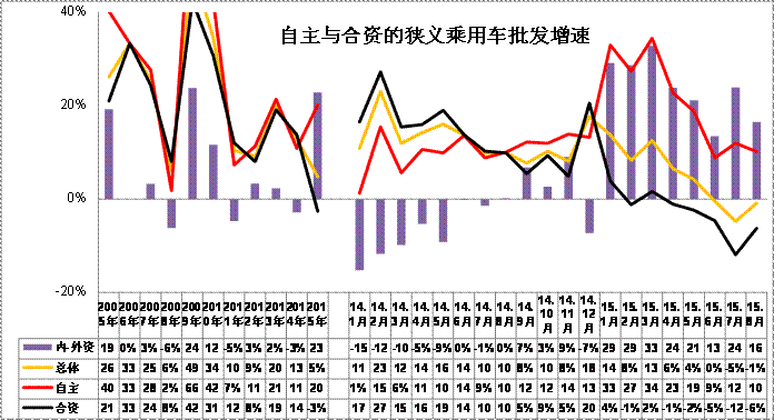 13年的自主增速21%,稍快于合資企業的增速2個百分點,14年年自主增速11%,低于于合資增速3個百分點,15年1-8月的形勢翻轉,自主高于合資增速26個百分點。14年的1-8月的自主增速落后合資較多,這也是15年初的自主品牌增速高的較好基礎,自主因此表現突出。