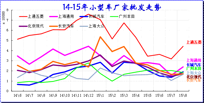 5、經濟型車廠家銷量走勢 8月的小型車自主廠家走勢較弱,但合資主力廠家表現逐步改善,日系走強。五菱、長安等近兩個月自主表現偏弱。合資企業雖然