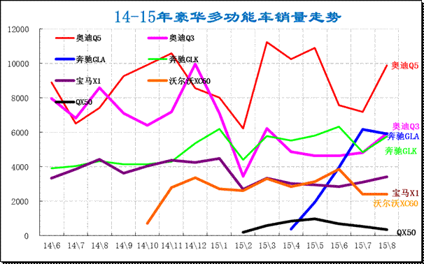 豪華SUV是爭奪焦點,8月的豪車SUV表現相對較強。奔馳GLK的增長勢頭較強勁,而奧迪Q5經過兩個月調整而進入回升期。A級豪華SUV表現偏弱,近期的寶馬X1走勢弱于奧迪Q3,奧迪的suv優勢較明顯,隨著奔馳GLA推出,豪車的國產化競爭更為充分。奔馳GLK的銷量也是持續走強,而沃爾沃XC60和英菲尼迪QX50也進入國產低價競爭序列,豪華B級SUV等的競爭加劇。而消費者對豪車的B級車型的需求逐步增大。