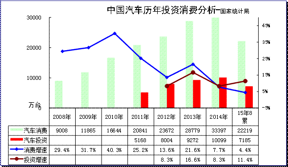 2015年1-8月份,全國固定資產投資(不含農戶)338977億元,同比名義增長10.9%,增速比1-7月份回落0.3個百分點。第二產業中,工業投資137087億元,同比增長8.7%,增速比1-7月份回落0.3個百分點;其中,采。1-8月汽車行業投資增長11.4%,放緩較大。