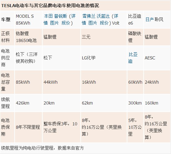 TESLA電動車與其它品牌電動車使用電池的情況