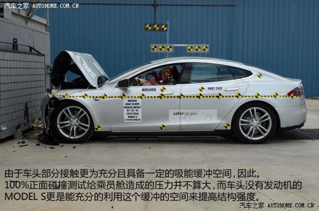 在100%正面碰撞測試中,MODEL S以56km/h的速度撞向剛性壁障,從碰撞過程中的車身姿態來看,相比我們在C-NCAP碰撞測試時看到的情況有所不同,MODEL S的車尾并沒有出現大幅度抬起的情況,這與整個車身的重量分布有關,MODEL S的電池分布在車底,電機位于后車橋,而車頭前部又不像傳統汽車那樣裝有動力總成,所以,整車的重量基本都集中在車輛底部和尾部并且重心較低,這樣,在這項碰撞測試中,車身的幅動相對較小。