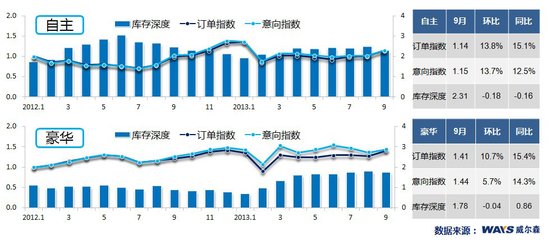 時下正是“金九銀十”,在整個市場氣氛熱烈的背景下,自主品牌表現亮眼,終端訂單、意向升幅環比超過了合資品牌和豪華品牌,庫存深度降幅亦較后兩者大。長城汽車的哈佛H系列持續熱賣,訂單量環比增加10.2%。上海汽車在9月推出榮威350的新優惠政策,經銷商也加大了熱銷車型的優惠,拉動訂單量環比上漲13.4%。