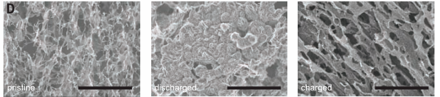 劍橋大學(xué)的研究人員改用多層次的大孔石墨烯作為正極材料,利用水和碘化鋰作為電解液添加劑,最終產(chǎn)生和分解的是氫氧化鋰,而不是此前電池中的過氧化鋰。氫氧化鋰比過氧化鋰要穩(wěn)定,大大降低了電池中的副反應(yīng),提高了電池性能。其中碘化鋰除了幫助分解氫氧化鋰外,似乎還起到了保護鋰金屬負極的作用,使電池對于過量的水有一定的免疫性。沒有它,同量的水會直接使電池失效,完全無法充放電。由于石墨烯氧化物具有多孔性,研究人員估計這種電池可循環(huán)超過2000次。