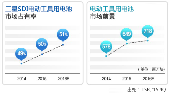 在電動工具市場,三星SDI的技術實力受到認可之后,TTi, Stanley Black & Decker, MAKITA等電動工具全球主流企業(yè)都向三星SDI的電動工具用電池伸出了橄欖枝。截止去年,向4大主流企業(yè)出售的電動工具用電池突破9億塊。如此驕人的成果,使得三星SDI成為電動工具用電池市場的第一。曾經由日本企業(yè)占據(jù)的電動工具市場,現(xiàn)在三星SDI的占有率已經達到50%。