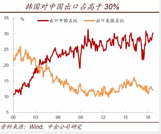 目前的蘋果供應鏈上,核心器件以韓國為主。從韓國的出口國家構成來看,韓國對中國和美國的出口份額加總接近韓國的總出口的近一半,其中韓國對中國的出口占總出口的比例達到30%,是最主要的出口國。因此韓國的出口很大程度上是受到中國和美國經濟的影響,尤其是受到中國的影響。