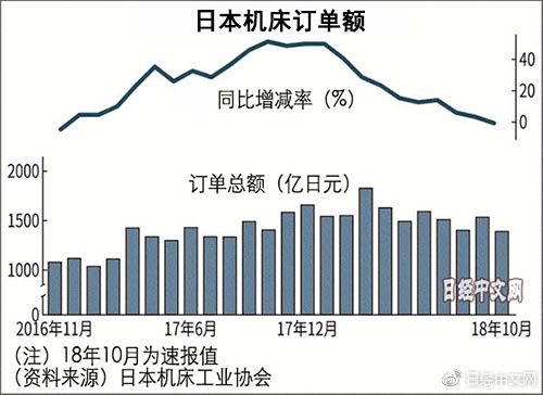 日本機床訂單情況,一直被用作觀察國內汽車和智能手機生產情況的風向標。日本機床工業會11月12日發布的數據顯示,10月的機床訂單額同比下滑1.1%,降至1391.77億日元,從單月數據來看,自2016年11月以來時隔23個月首次下滑。主要原因被認為是面向中國的訂單額下滑。