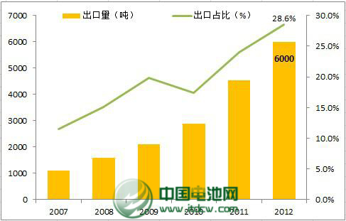 據中國化學與物理電池行業協會統計數據顯示,2012年鈷酸鋰正極材料總產量2.1萬噸,其中出口量為6000噸,占比28.6%;而從正極材料的出口數據看,2012年中國正極材料出口量為8000噸,其中鈷酸鋰出口占比達75%。