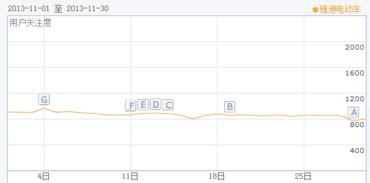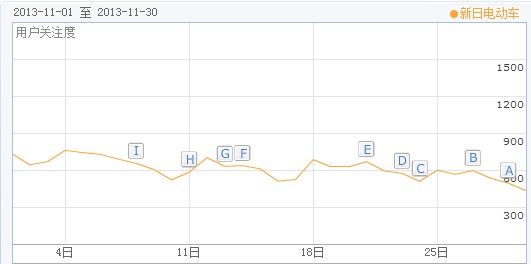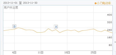 另外,雅迪的標題浮現率仍然保持在高水平,100%的標題浮現率充分表明了雅迪在網絡營銷推廣方面愈益成熟。十一月份雅迪在產品宣傳上主要集中在聚能王系列的宣傳推廣,聚能王針對冬季市場的抗寒特性,使雅迪在北方市場應對淡季策略方面領先于其他品牌。加上雅迪3699萬獨家冠名《CCTV家庭幽默大賽》,以及在巴西展的突出表現,這些都在很大程度上推升了雅迪十一月份的品牌關注度。據百度指數顯示,雅迪十一月份的用戶關注度接近867分,位列行業第一。