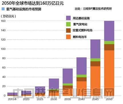 剛剛在10月發(fā)行了《世界氫氣基礎(chǔ)設(shè)施項目總覽》的日經(jīng)BP清潔技術(shù)研究所稱,到2015年,世界氫氣相關(guān)市場規(guī)模約為7萬億日元。之后,燃料電池車與定置燃料電池將帶動市場擴大,市場規(guī)模將在2020年超過10萬億日元,到2030年將達到約37萬億日元。到那時,各國的發(fā)電企業(yè)都將積極投資氫氣發(fā)電,投入運營。2050年的市場規(guī)模預(yù)期高達160萬億日元。