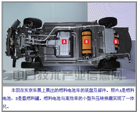 豐田在東京車展上展出的燃料電池車的底盤及部件。照片A是燃料電池,B是氫燃料罐。燃料電池與高效率的小型升壓轉(zhuǎn)換器實(shí)現(xiàn)了一體化。