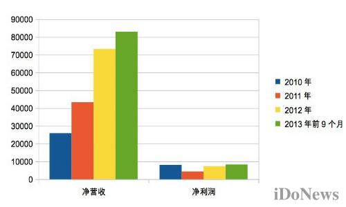 公司凈營收從2010年至2012年,三年間的凈營收年復合增長率達62.7%,截止2013年9月30日的前三季度,公司凈營收8.306億元,較去年同期5.108億元,同比增長62.6%。