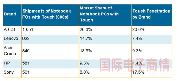 2013年上半年,全球觸控筆記本電腦出貨量達到620萬臺,占筆記本電腦出貨總量的7%。其中觸控功能超薄筆記本電腦的出貨量最高,達到170萬臺;其余450萬臺為一般觸控功能筆記本電腦。2013上半年觸控功能筆記本電腦出貨最多的品牌是華碩(ASUS),其次是聯(lián)想(Lenovo)、宏基(Acer)、惠普(HP)和索尼(Sony)。