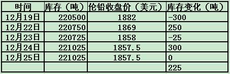 12月19日至12月25日倫鉛總體走勢趨緩,總體在1850左右小幅震蕩,昨晚因圣誕節,外盤休市,庫存返利變動幅度也不大,本周累計增加225噸。