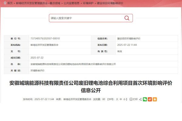 安徽城瑞能源科技有限責任公司廢舊鋰電池綜合利用項目建設地點為蚌埠市經開區智能制造產業園 ... 查閱全文