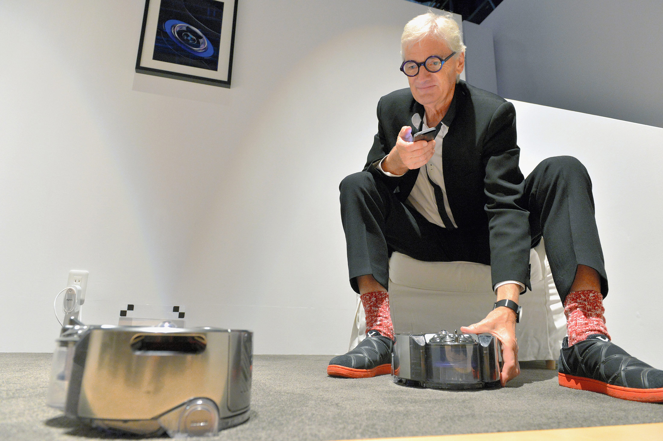 戴森公司創始人兼董事長詹姆斯·戴森在東京展示機器人吸塵器“戴森360 Eye”