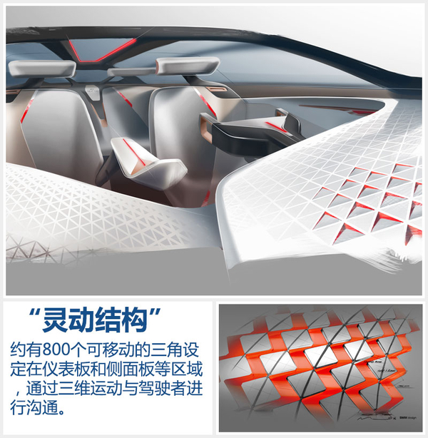 “BMW VISION NEXT 100”概念車應用了名為“靈動結構”的全新技術,約有800個可移動的三角設定在儀表板和側面板等區域,通過三維運動與駕駛者進行溝通。全新技術可與平視顯示系統結合,將模擬和數字功能融合,利用不同的直觀信號,提前預知即將發生的情況。