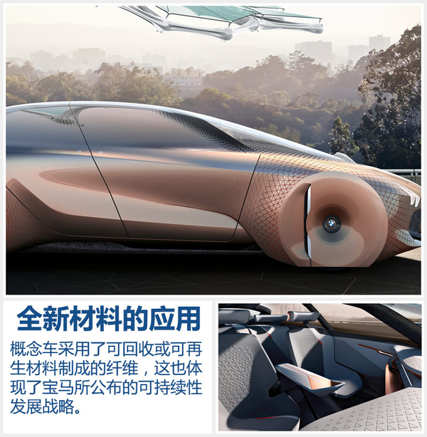 “BMW VISION NEXT 100”概念車另一項重要技術便是采用了可回收或可再生材料制成的纖維,這也體現了寶馬所公布的可持續性發展戰略。寶馬官方表示:未來,材料的選擇在整個設計和制造流程中會變得越來越重要。例如,新車側圍版便采用了由標準碳纖維生產中多余的材料制成,并將在未來研發更多新型環保材料。新車的內飾用料全部采用高品質的織物和易于回收的材料,取消了真皮內飾減少使用木質部件,整車更加迎合環保的理念。