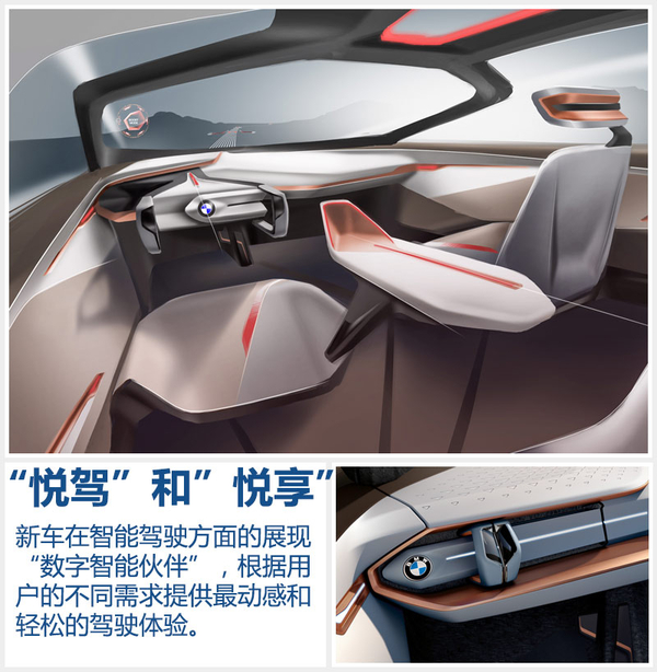 在車內還有一個比較吸人眼球的就是位于儀表板中間的“寶石”,這其實是新車在智能駕駛方面的展現“數字智能伙伴”。通過對于駕駛者習慣的分析,可以自動執行一些常規任務,并且駕駛者需要時提供恰當的建議。之前我們還提到了關于“BMW VISION NEXT 100”概念車配備的“悅駕”(Boost)和”悅享”(Ease)兩大模式,其指在根據用戶的不同需求提供最動感和輕松的駕駛體驗。首先,在“悅駕” (Boost)模式中,車輛將以駕駛者為中心,提供多種智能化支持。同時座椅、方向盤甚至數字智能伙伴將縮回儀表板內,中控臺也更多地朝向駕駛者。而當切換到“悅享”模式時,車輛將進入主動控制模式,數字智能伙伴會自動彈出,成為人機溝通的界面。