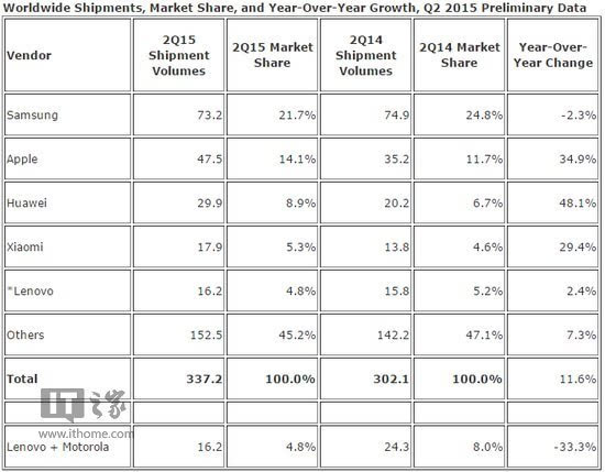 IDC數據顯示,2015二季度是有史以來出貨量最高的第二季度,智能手機廠商全球出貨量共計3.372億,同比去年3.021億增長高達11.6%。三星雖然奪得第一,但市場份額下降了3.1個百分點(從24.8%下降到21.7%),據悉原因很可能是三星S6 Edge出現供貨問題導致。