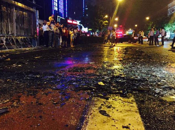 大火撲滅后,公交車也基本報廢,僅剩下鐵架子,路面上散滿一堆碎玻璃渣。目前,受輕傷人員已被送往醫院診治。