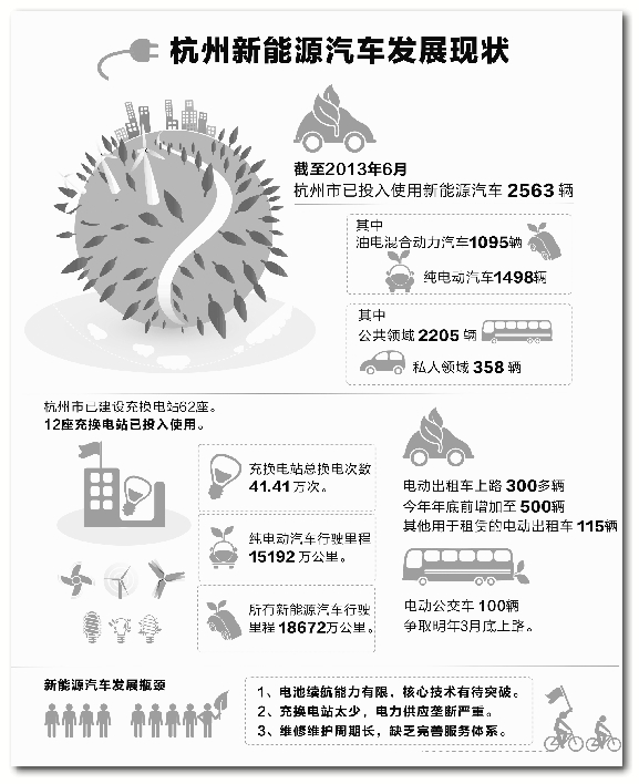 記者昨天從杭州市經信委獲悉,截至2013年6月,杭州市已投入使用節能與新能源汽車2563輛,其中公共領域2205輛、私人領域358輛。建成62座充換電站,其中12座已投入使用,300多輛電動出租車已開上杭城街頭,電動汽車租賃也正在被越來越多的市民接受……