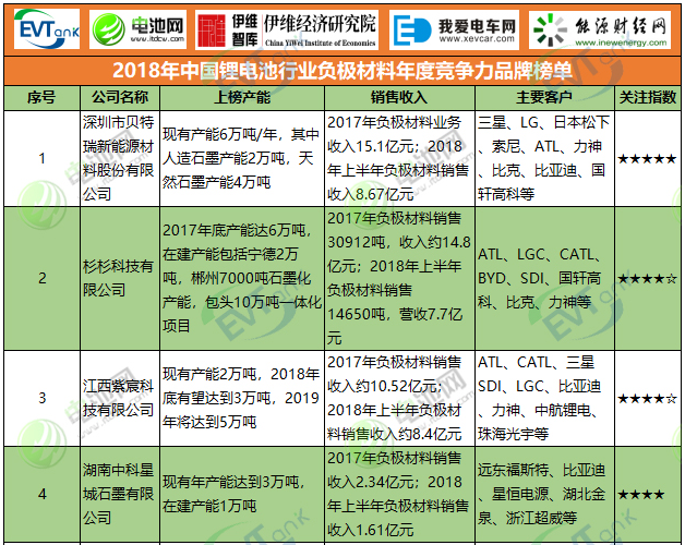 2018年中國鋰電池行業負極材料年度競爭力品牌榜單