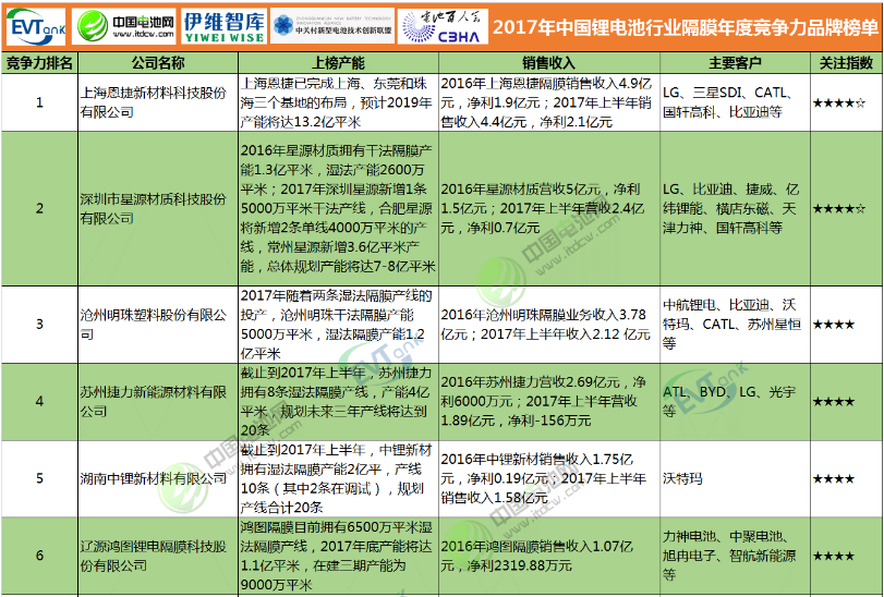 2017年中國鋰電池行業隔膜年度競爭力品牌榜單