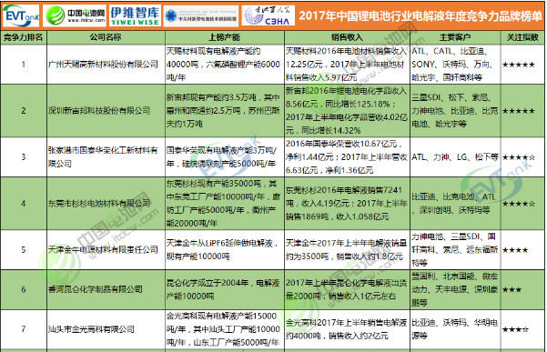 2017年中國鋰電池行業電解液年度競爭力品牌榜單