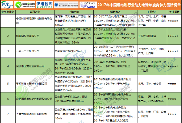 2017年中國鋰電池行業動力電池年度競爭力品牌榜單