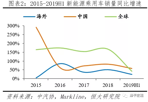 2019上半年中國新能源乘用車市場份額過半,增速遠超海外。據中汽協統計,2019H1國內新能源乘用車(EV+PHEV)銷售56.29萬輛,同比增長57.75%。據Markline統計,2019H1海外新能源乘用車銷售42.13萬輛,同比增長24.50%。2019H1全球新能源乘用車合計銷售98.42萬輛,中國占比57.19%,超過一半,增速較國外高33.25個百分點。