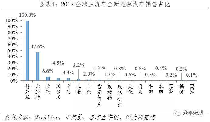 特斯拉、比亞迪新能源車型滲透率遠超其他車企,美國、日本車企電動化轉型步伐較慢。分車企來看,2018年新能源汽車新車銷量占比,除特斯拉100%、比亞迪47.6%外,其他車企皆低于10%;其中北汽、沃爾沃、寶馬、三菱、上汽超過2%,通用、福特、豐田、本田等不到1%。