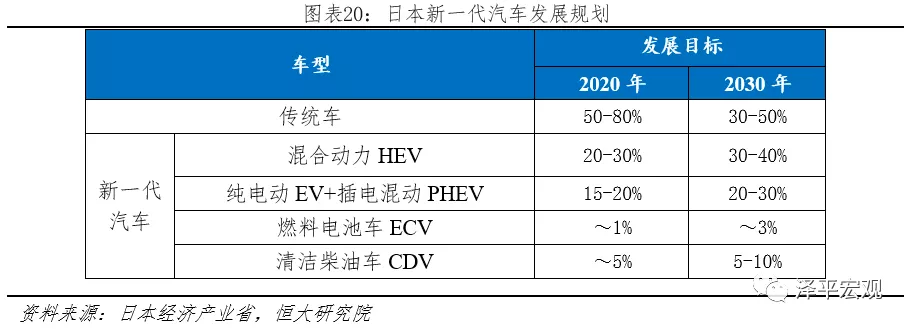 2020年、2030年新能源汽車分別占比15-20%、20-30%。2010年4月日本經濟產業省發布《下一代汽車戰略2010》,將下一代汽車定義為:非插電式混合動力汽車(HEV)、純電動汽車(BEV)、插電式混合動力汽車(PHEV)、燃料電池汽車(FCV)、清潔柴油汽車(CDV)等。并首次公告發展目標:到2020年,下一代汽車將在新車銷量中力爭達到20%~50%;到2030年,下一代汽車將在新車銷量中力爭達到50%~70%,并沿用至今。