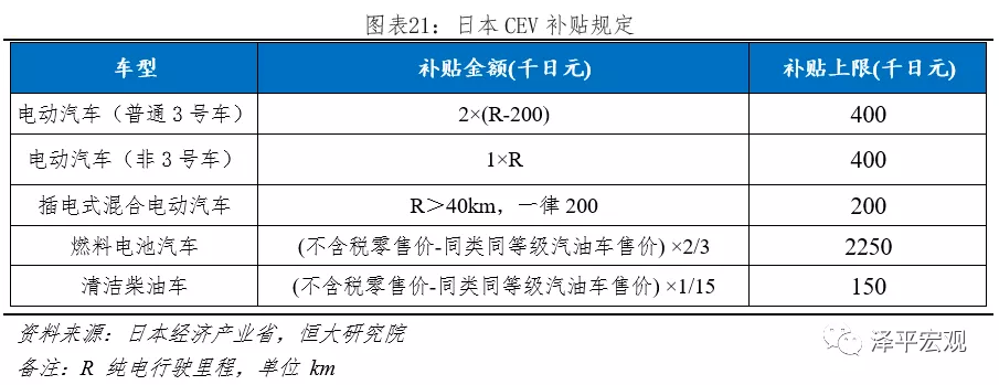 新能源財政補貼由經濟產業省主導,分為四類:1)節能車補貼;2)CEV(CleanEnergy Vehicle)導入補貼;3)充電設施補貼;4)加氫設備補貼。其中節能車補貼于2012年9月廢除,被CEV補貼取代;加氫設備補貼主要針對氫燃料電池,充電設施補貼主要針對充電樁,當前新能源汽車主要推動力在“CEV導入補貼”。